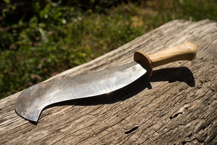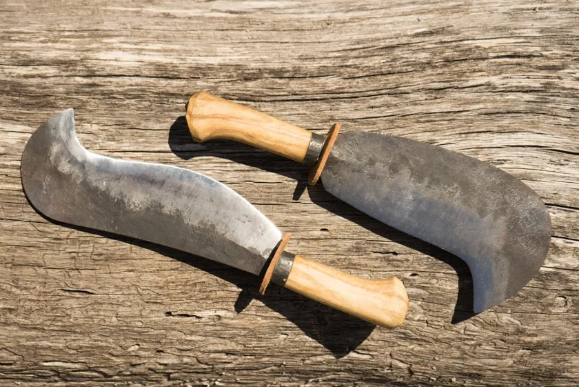 Des modèles de serpes à bec (une ventrue, l'autre massive) pour l'élagage, l'entretien des haies ou encore pour fendre du bois, munies de têtes massives pour une meilleure inertie.