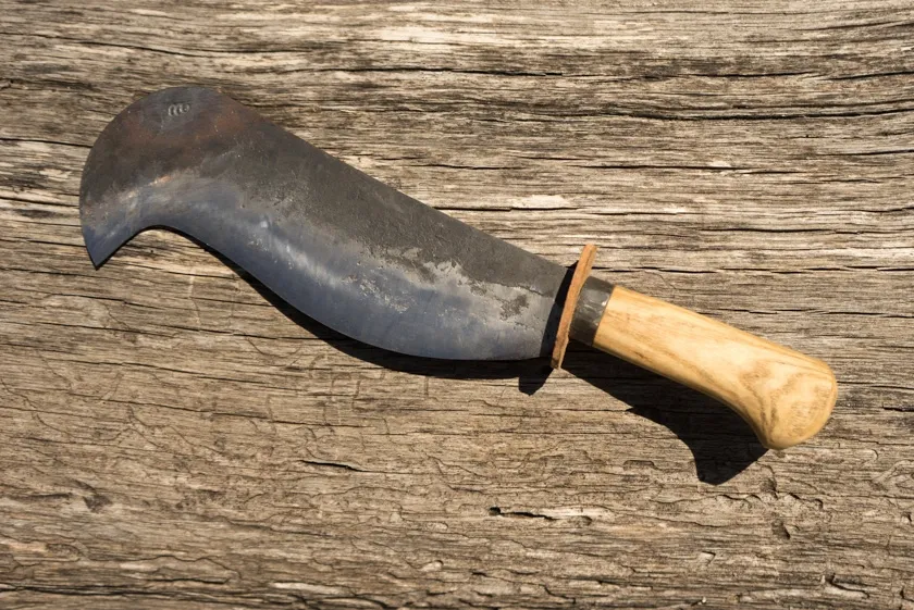 Des modèles de serpes à bec (une ventrue, l'autre massive) pour l'élagage, l'entretien des haies ou encore pour fendre du bois, munies de têtes massives pour une meilleure inertie.